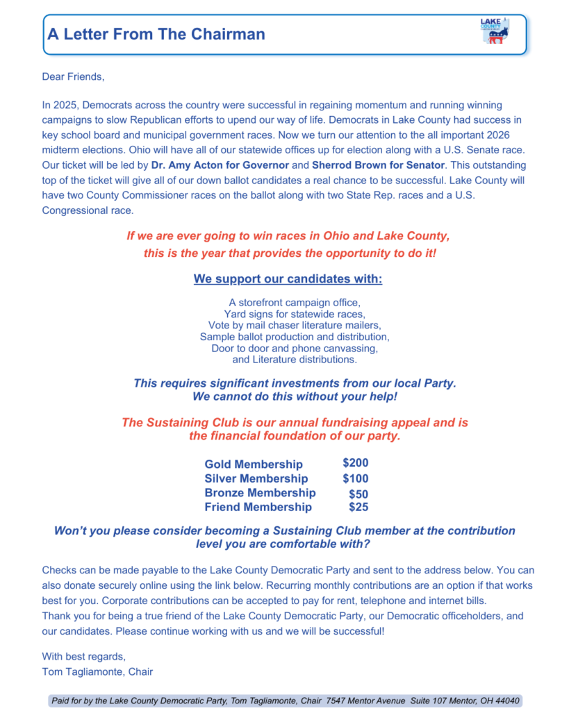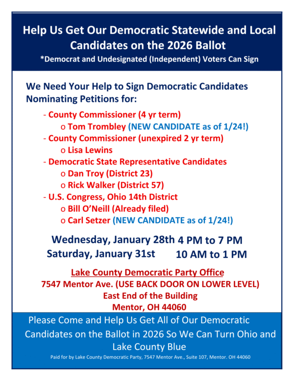 The Lake County Democratic Party is the local affiliate of the Ohio Democratic Party representing Lake County’s more than 30,000 registered Democrats.