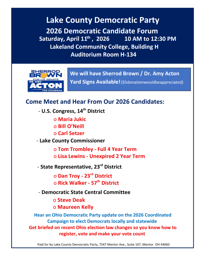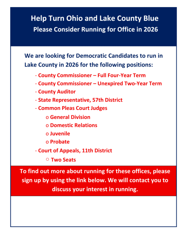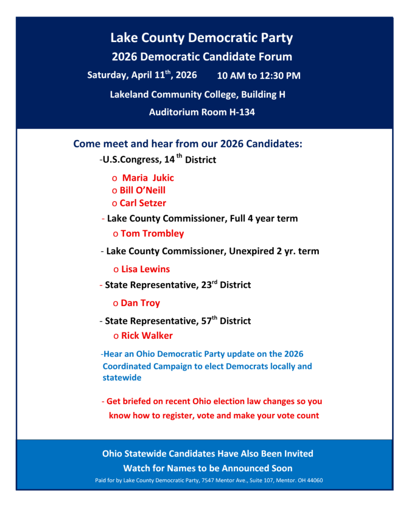 The Lake County Democratic Party is the local affiliate of the Ohio Democratic Party representing Lake County’s more than 30,000 registered Democrats.